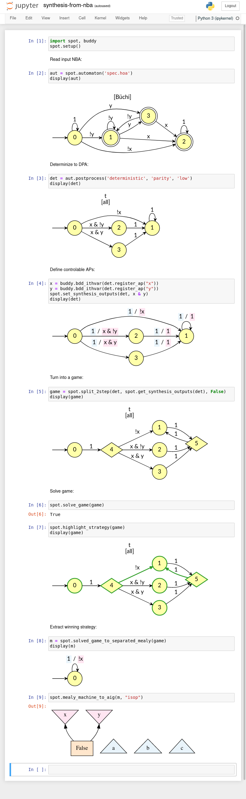 Wonderful! Confirm it works. A small correction: in your jupyter notebook you set outputs "x,y" whereas originally they were inputs. So instead I used a new variable "z": z = buddy.bdd_ithvar(det.register_ap("z")) spot.set_synthesis_outputs(det, z) And the outcome is the same ("realisable"). best wishes, a. On Mon, Jan 3, 2022 at 12:30 PM Alexandre Duret-Lutz <adl@lrde.epita.fr> wrote: